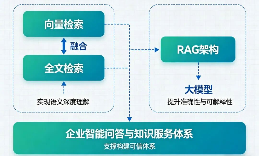 在AI智能搜索中,通过向量检索与全文检索的融合,实现对语义的深度理解,并可结合RAG架构提升大模型输出的准确性与可解释性,支撑企业构建可信的智能问答与知识服务体系。