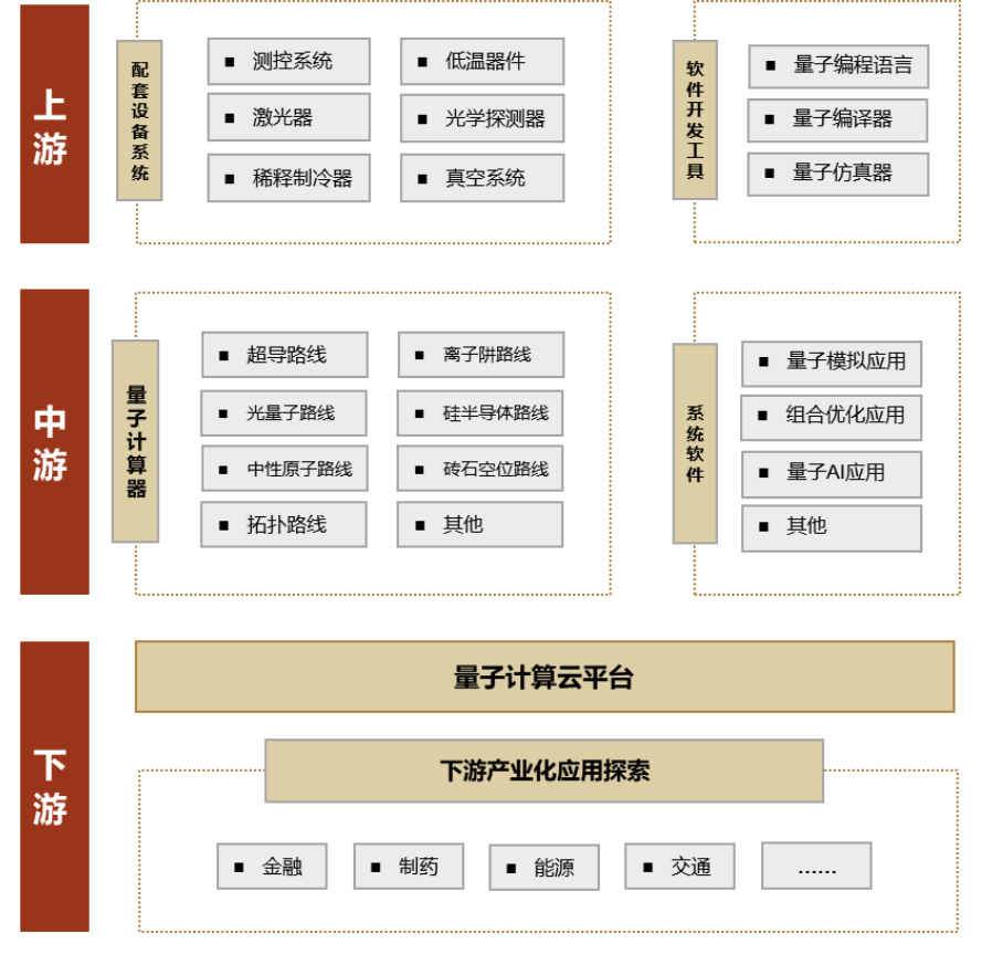 量子计算产业链主要分为上游、中游和下游三个环节。上游环节以核心器件与基础设施为主,涵盖量子芯片(如超导、光量子、离子阱、中性原子芯片)、稀释制冷机、低温组件、真空系统、激光器、测控系统、光学探测器等设备,以及关键材料和相关软件开发工具,是量子计算硬件研发的基础和保障。中游主要包括量子计算机整机制造和系统集成,以及软件层面的操作系统、编程语言、集成开发环境、量子算法和行业应用软件开发,具体涉及多种主流技术路线(如超导、离子阱、光量子等)。下游则聚焦于量子云平台与各行业的应用服务,通过云平台或本地部署向金融、化工、材料、生物医药、交通、能源等领域提供算力支持和行业解决方案,实现技术的商业化落地和推广应用。