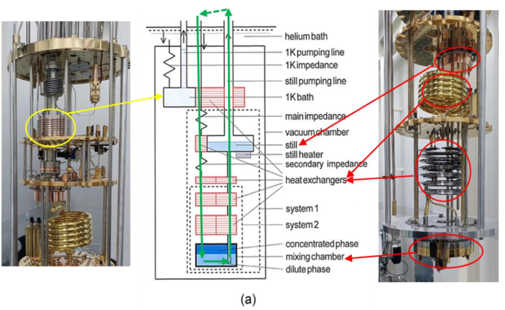 稀释制冷机为量子计算提供必需的低温环境。其主要原理是利用和两种同位素的混合物在接近绝对零度(毫开尔文mK量级)时发生相分离,从浓缩相向稀释相扩散时会吸收大量热量,实现环境降温。稀释制冷机由蒸馏室、混合室、热交换器、真空腔等核心部件组成,通过层层降温和连续的气体循环,将目标实验区域温度稳定在10mK或更低。由于量子比特对热噪声极其敏感,哪怕极微小的热扰动都可能导致量子态坍缩、破坏计算结果,因此稀释制冷机成为目前唯一能够为超导量子芯片等提供持续、稳定毫开尔文级极低温环境的器件,是量子计算机正常工作的不可替代的关键装备,具有极高的技术壁垒和战略必需性。