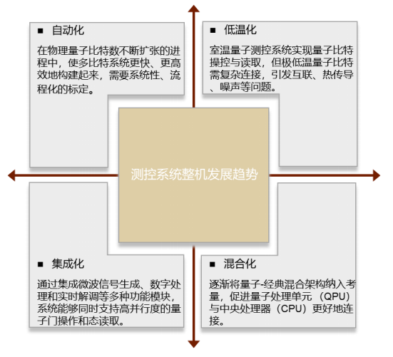 量子计算测控系统可按技术路线分为两类,一类是适配硅半导体等技术路线的微波测控系统,另一类是支撑超导等其他量子比特技术的专用测控系统。目前,中国在量子计算测控系统领域已实现从 “实验室定制” 到 “工程化量产” 的关键跨越,本源量子、国盾量子等头部企业均已推出性能稳定的商用化测控系统,有效打破了国外技术垄断。从发展趋势来看,我们预计未来量子计算测控系统将朝着自动化、低温化、混合化、集成化四大方向持续迭代,以进一步提升量子比特操控精度与系统运行效率。