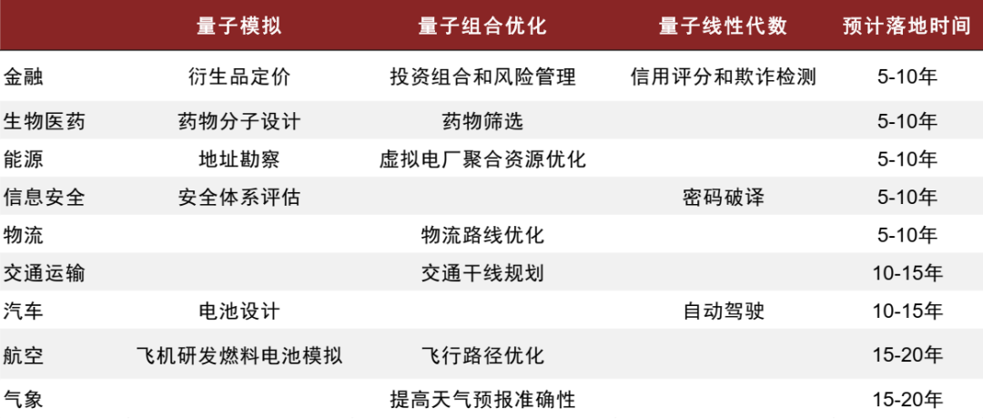 图表27:量子计算在各行业领域的具体应用场景及预计落地时间