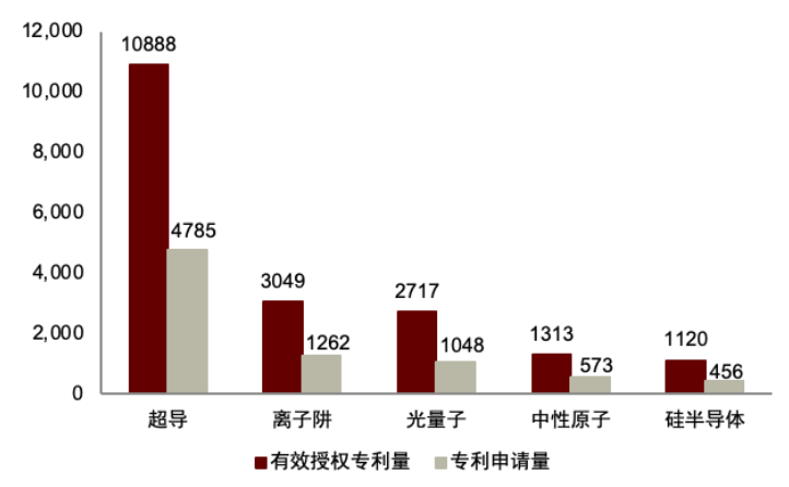 多线路协同探索正引领量子计算技术向“高稳定性—高保真度—可扩展性”方向演进,共同推动未来量子计算机从实验验证步入商业化应用。从发展进度来看,超导量子凭借高保真度、易扩展性及成熟的制程工艺在产业化道路上保持领先,全球有效授权专利量达10,888项,位居首位,发展前景最为稳健;离子阱路线具备很高的保真度,但可扩展性较差,有效授权专利量3,049项,整体发展略逊色于超导技术;中性原子路线近年来突破显著,展现出更强的可扩展性,但在提高保真度上仍面临技术挑战,有效授权专利量为1,313项,发展进度相对落后于前两者。