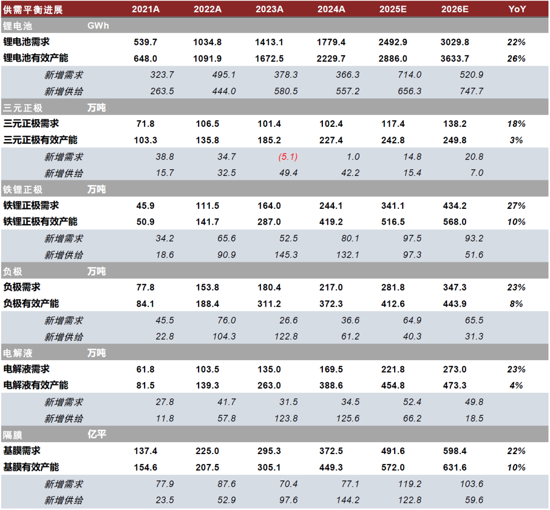 新能源车中游锂电板块经历2-3年下行周期,2025年以来伴随产业链价格逐步企稳、供需结构改善,底部反转趋势逐步显现,我们认为新一轮上行周期有望启动。本轮周期的核心驱动主要来自需求结构的变化、场景的多元化以及海外新一轮新车周期释放。具体而言: