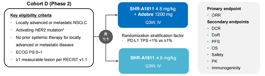 本研究为一项多中心、开放标签、Ib/Ⅱ期研究(NCT05482568)中的随机Ⅱ期队列(队列D),纳入未经治疗的HER2突变晚期NSCLC患者,随机接受:瑞康曲妥珠单抗(4.8 mg/kg,静脉输注,Q3W)联合阿得贝利单抗(1200mg,静脉输注,Q3W)或瑞康曲妥珠单抗单药(4.8 mg/kg,静脉输注,Q3W)治疗。