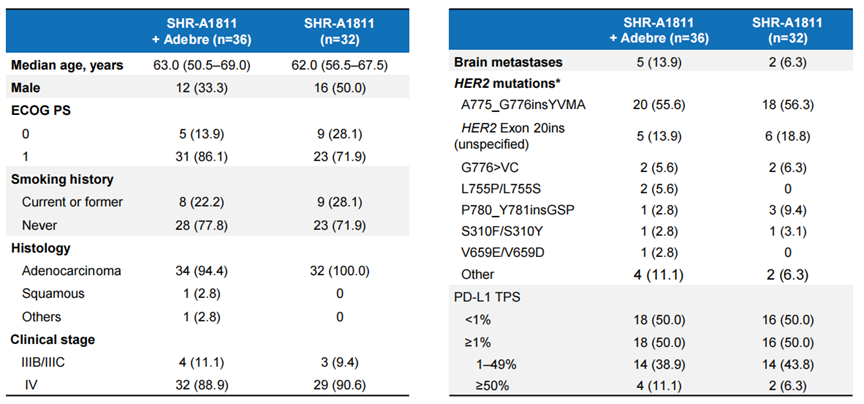 截至2025年10月20日,研究中位随访时间为16.7个月。本研究共纳入68例一线晚期HER2突变NSCLC患者,其中联合组36例患者接受瑞康曲妥珠单抗联合阿得贝利单抗治疗,单药组32例患者接受瑞康曲妥珠单抗单药治疗。