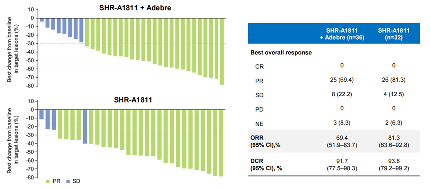 研究结果显示:瑞康曲妥珠单抗联合阿得贝利单抗的ORR为69.4%(95% CI: 51.9–83.7),瑞康曲妥珠单抗单药的ORR达81.3%(95% CI: 63.6–92.8),两组DCR分别为联合组91.7%,单药组93.8%。