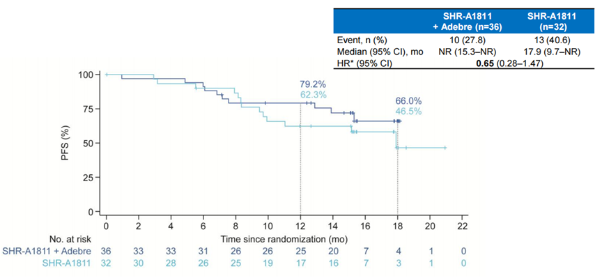 中位随访时间为16.7个月,联合组的mPFS尚未达到(15.3-未达到),单药组mPFS为17.9个月(9.7-未达到),HR 0.65(95% CI: 0.28-1.47)。