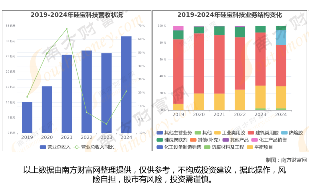 硅宝科技2024年数据显示(如上图),公司2024年营业收入31.59亿,同比增长21.24%。