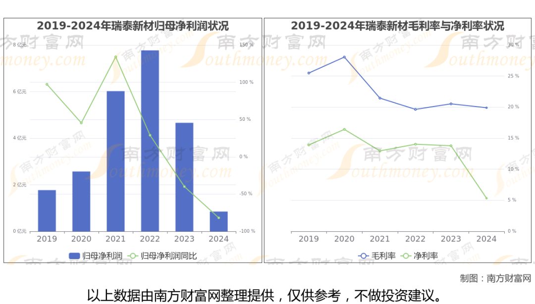 数据显示(如上图),瑞泰新材公司2024年营业收入21.02亿,同比增长-43.47%,近5年复合年增长率(CAGR)3.74%。