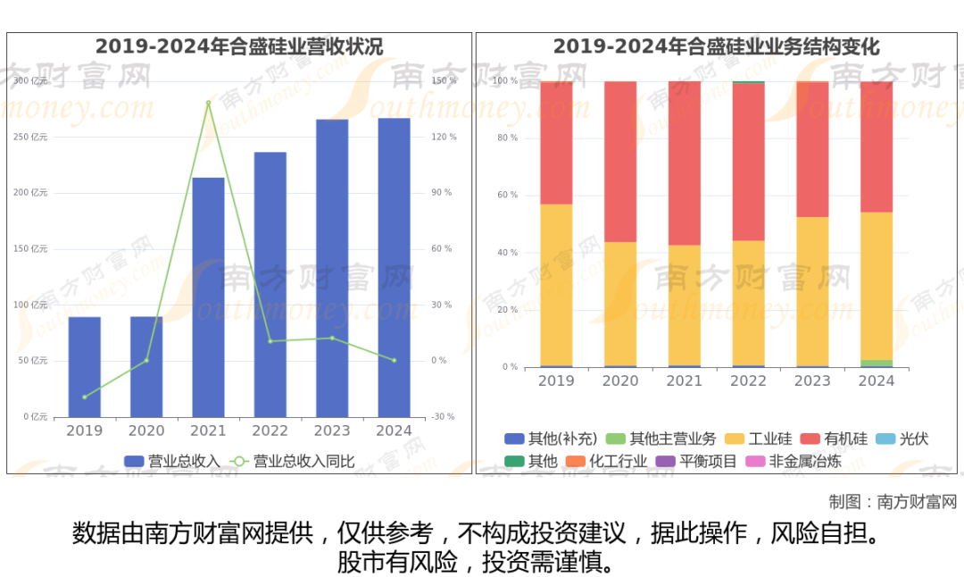 (如上图)2024年合盛硅业公司营业总收入266.92亿,同比增长0.41%,近五年复合增长率为31.35%。