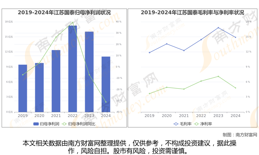 根据公司年度数据显示(如上图),2024年,江苏国泰实现营业总收入389.56亿,同比增长4.76%,近5年复合年增长率6.63%。