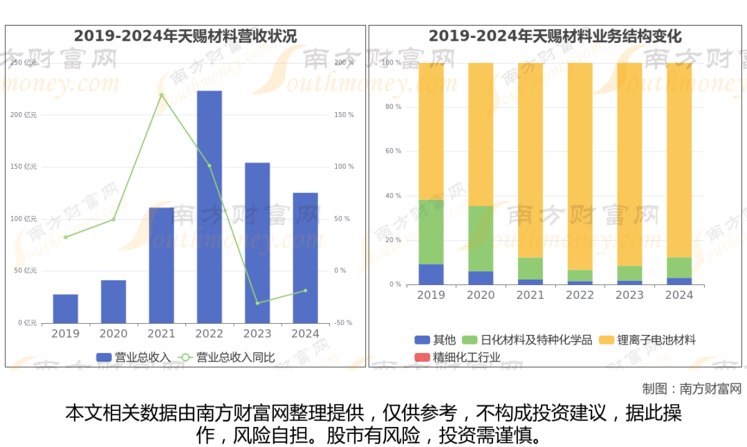 数据显示(如上图),天赐材料公司2024年营业收入125.18亿,同比增长-18.74%,近5年复合年增长率(CAGR)32.03%。