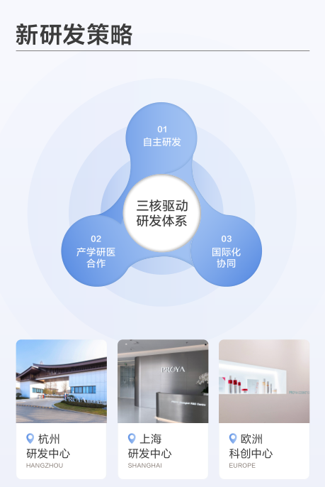 目前,珀莱雅已形成“自主研发 产学研医合作 国际化协同”的三核驱动体系,落地杭州龙坞、上海及欧洲三大研发中心。