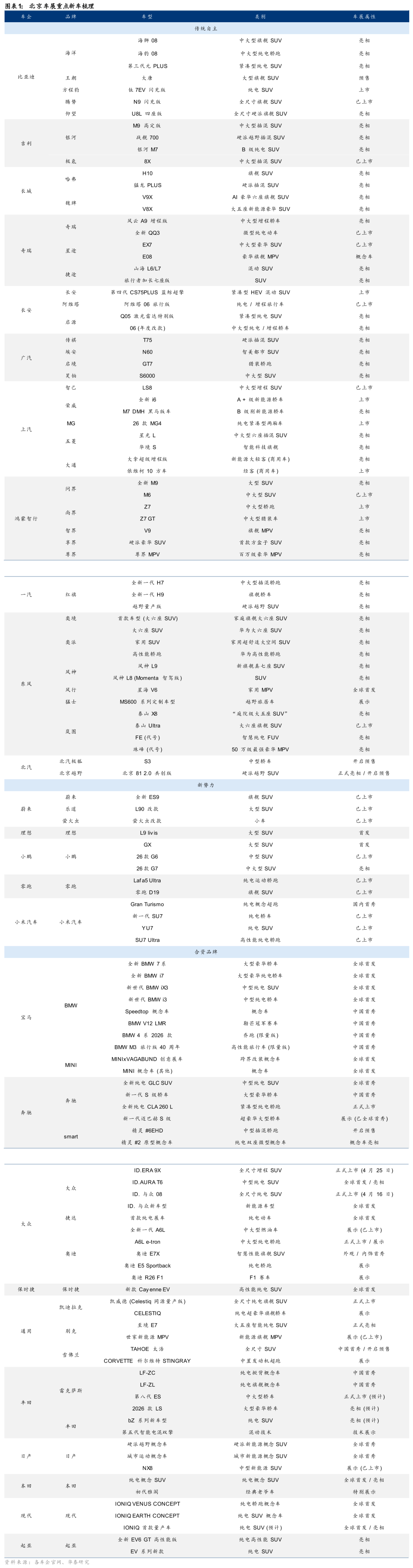 第十九届北京国际汽车展览会将于2026年4月24日-5月3日举办。根据官方统计,本次车展展车总数达1451台(其中全球首发车型181台、概念车71台),展出面积38万平方米,不仅规模跃居全球车展首位,新车数量也远超上届车展(参展车型294款,全新车型127款)。新能源车仍为本次车展主旋律,车型占比突破60%。其中我们建议关注自主品牌高端车型,特别是大型SUV的细分市场。