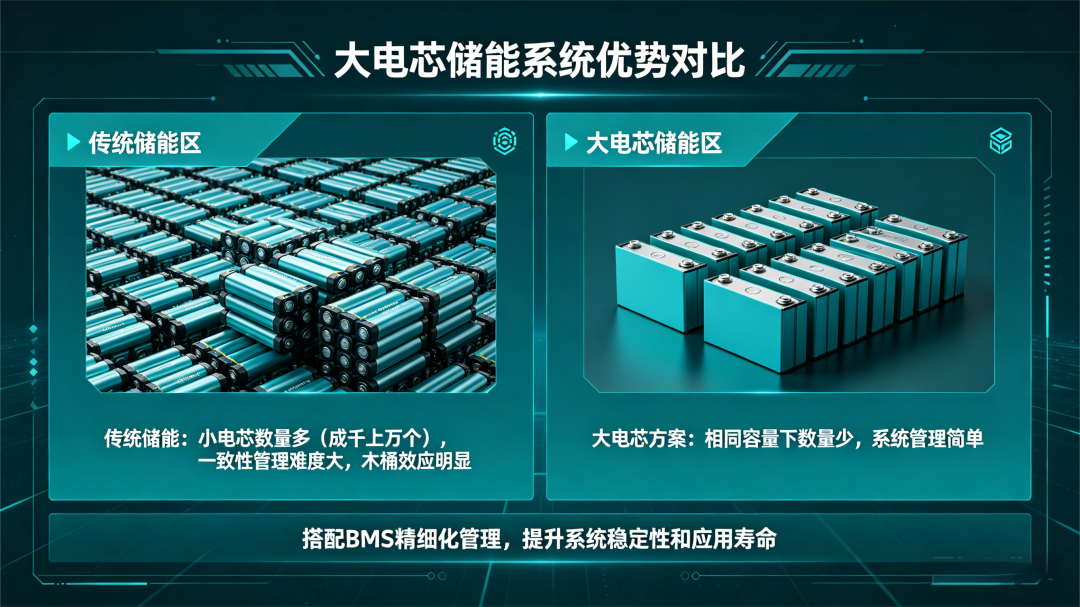 传统储能系统需集成成千上万个小电芯,电芯数量越多,一致性管理难度越大,“木桶效应”越明显。在相同容量下,采用大电芯的数量减少,系统管理更为简单,通过BMS精细化管理,可以提升系统稳定性和应用寿命。