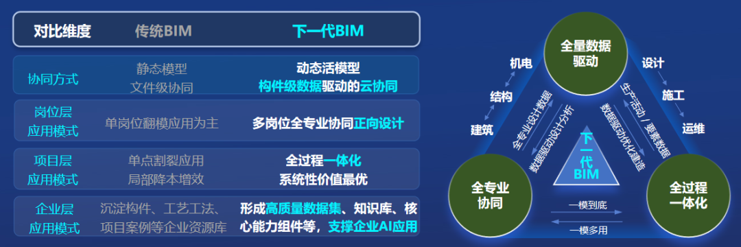 BIM技术作为智能建造和建筑产业AI的重要基石,新模式下设计端从建模出图转向模型定义产品,建造端从建模应用转向模型优化建造。下一代BIM是实现建筑品质高、项目效益高、建造安全高的BIM应用新范式。