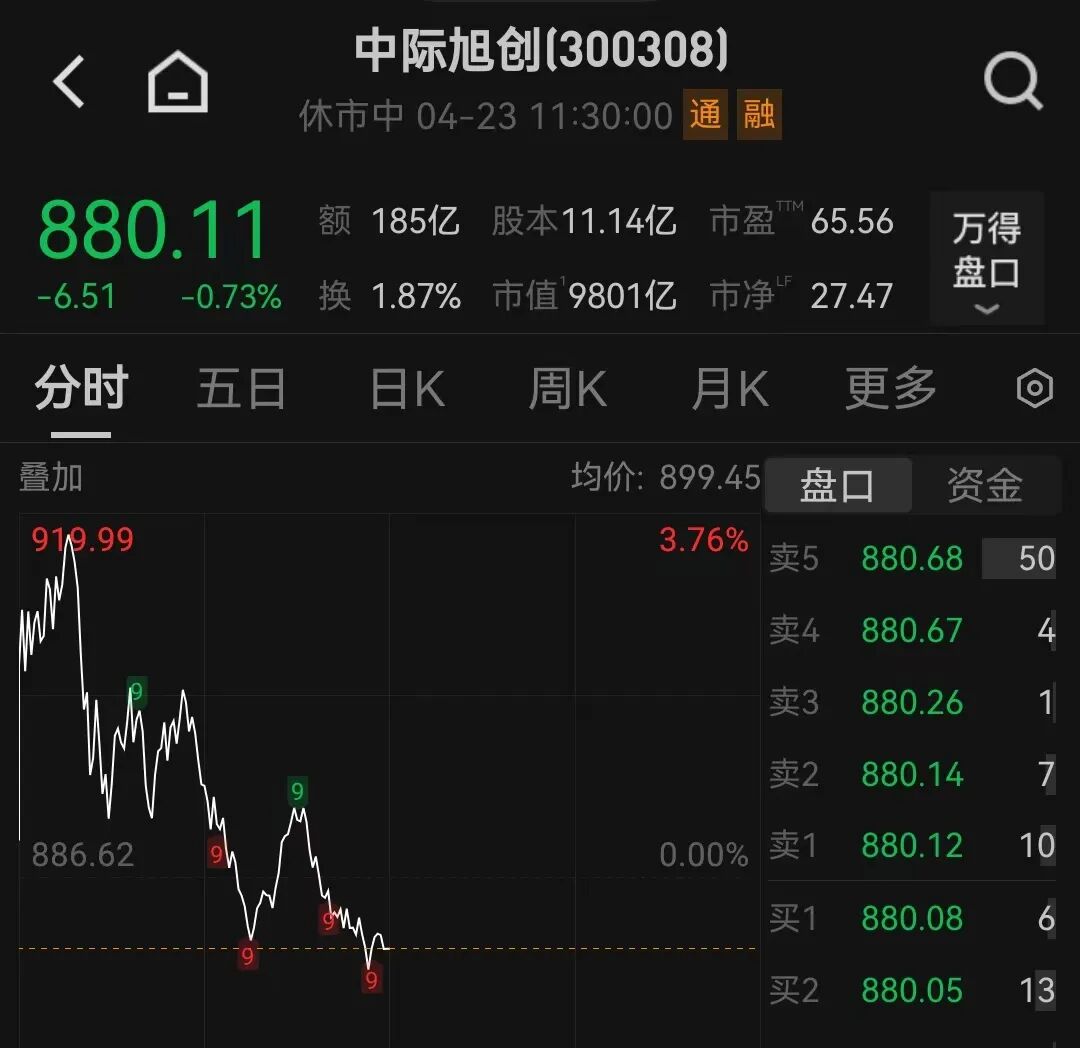 不过,随后中际旭创股价转跌,早盘收盘市值为9801亿元。