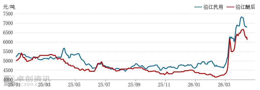 2月底中东局势升级,且霍尔木兹海峡受阻,中东原油、液化气等资源难以有效流出,受此影响原油以及国际LPG市场宽幅上扬,2025年中国进口中东液化气占比49.81%,因原油上涨以及预期国内进口码头资源不足,沿江当地价格跟随市场大势上涨。
