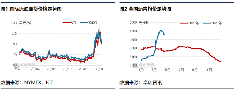 本周全国沥青均价为4489.86元/吨,环比下跌107.36元/吨或2.34%,西北地区沥青现货价格相对稳定,其余区域沥青现货价格均出现不同幅度下跌。首先,从成本端来看,尽管美伊首次和谈不畅,但市场预期二次和谈达成协议的概率较大,因此原油价格从高位稳步下行,成本端利好支撑走弱。其次,从供需角度分析,尽管沥青装置开工负荷率仍延续低位运行,但由于沥青市场仍处施工淡季,需求量相对偏小,加之由于沥青现货价格整体仍处于偏高水平,受限于偏高的材料成本,终端开工积极性较差,需求端偏弱持续施压,本周沥青现货均价继续下跌。