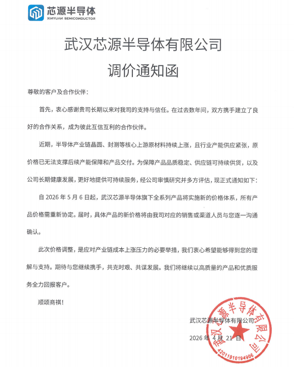 近日,力源信息旗下武汉芯源半导体有限公司正式发布调价通知函,宣布自2026年5月6日起,旗下全系列产品将实施新的价格体系,所有产品价格需重新协定。