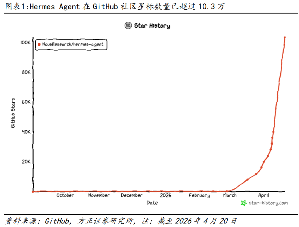 在本系列前序报告中,我们已就OpenClaw部署、其在金融投研领域的应用案例、以及多智能体协作等进阶功能进行了详细介绍。在OpenClaw广受关注的同时,另一款AI智能体产品——Hermes Agent也在GitHub社区迅速崛起。该产品于2026年2月底正式开源,首月即获得约2.2万星标。截至2026年4月20日,其星标数已突破10.3万,并连续多日位居全球开源热榜前列,显示出强劲的发展势头与社区关注度。