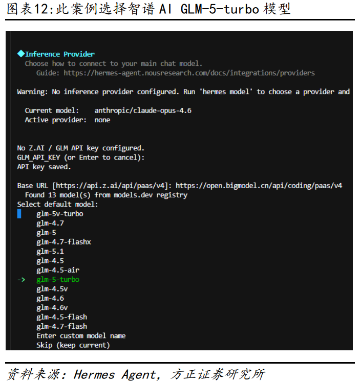 Hermes Agent目前已支持国内外主流的大模型,我们选择性价比更高的国产大模型,此处选择智谱AI的GLM-5-turbo,注意此处需要输入智谱AI大模型的API key,可以到智谱AI开放平台申请即可。