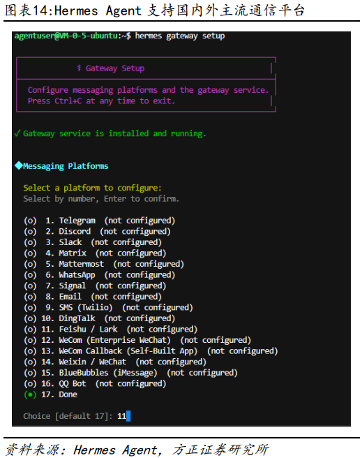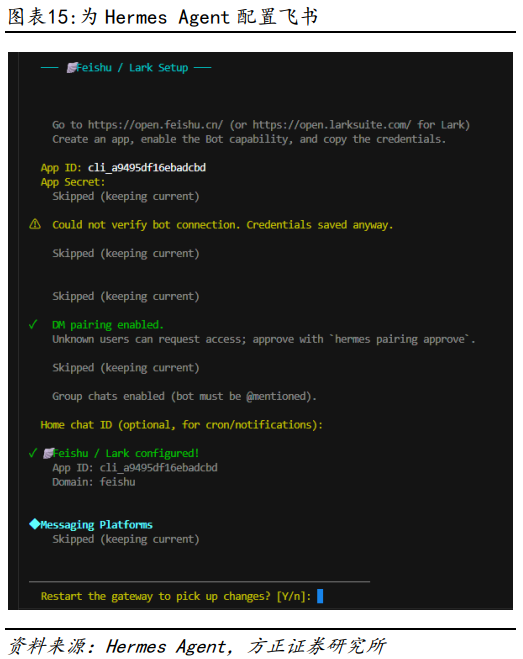 接下来我们为Hermes Agent配置飞书机器人,有关如何在飞书开放平台上创建飞书机器人的详细步骤,可以参考报告《个人AI助理OpenClaw部署及其在金融投研中的应用研究——AI Agent赋能金融投研应用系列之二》。本节中我们假设已经创建好了飞书机器人,并已获得其APP ID和APP Secret,我们直接在命令行中输入命令hermes gateway setup并回车,即可开启配置流程。