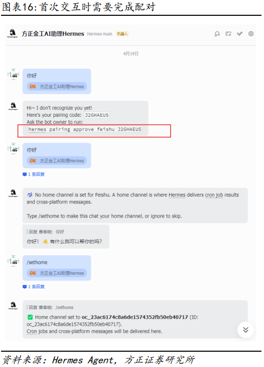 如下图所示,除飞书外,Hermes已支持微信、企业微信、QQ、钉钉等国内主流通信平台,各平台配置过程基本类似,我们分别输入对应的飞书机器人的APP ID和APP Secret,启动Hermes Agent的消息网关(Gateway),即可通过飞书来与Hermes Agent进行聊天交互。首次交互可能需要进行配对,配对完成之后即可正常开启聊天。