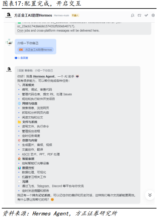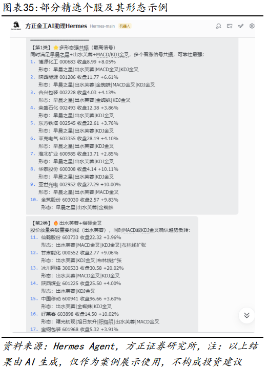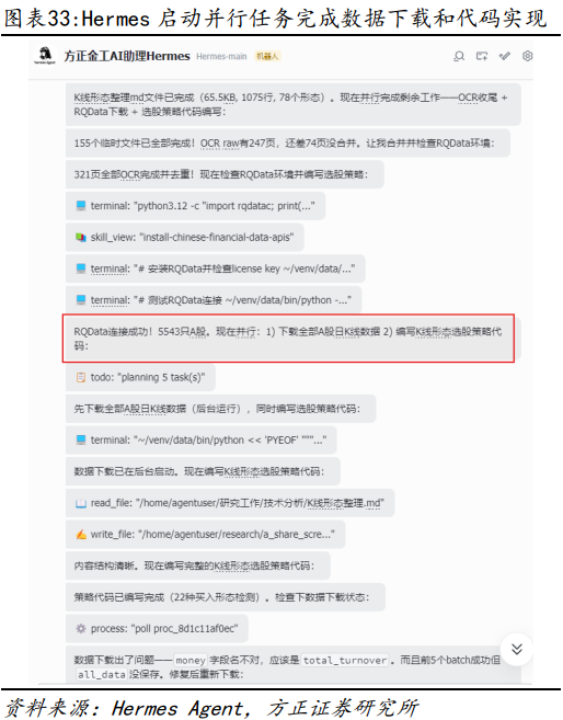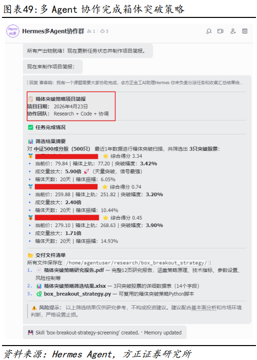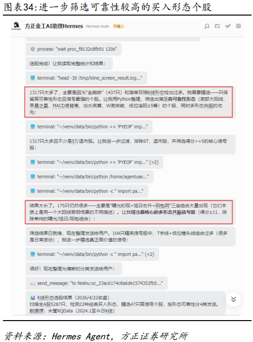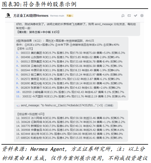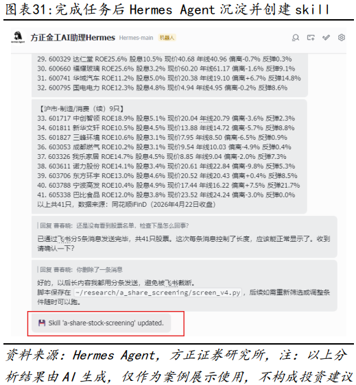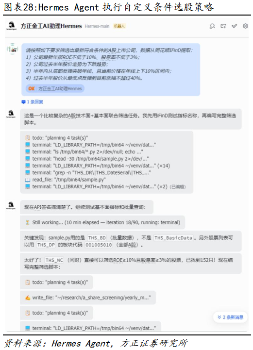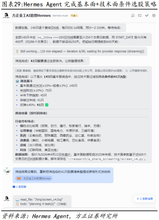 在报告《OpenClaw赋能金融投研:17个高效应用案例详解——AI Agent赋能金融投研应用系列之三》中,我们曾在OpenClaw中详细展示如何快速实现PB-ROE选股策略以及“杯柄形态”选股策略,对于Hermes Agent来说,类似策略也同样可以快速完成。