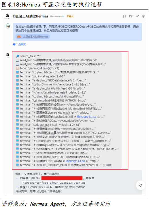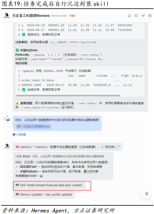 在本系列前序报告中,我们多次强调在金融市场投研分析中高质量数据的重要性,虽然目前各数据厂商推出了较多金融数据相关的skills,但从数据广度和质量角度,我们更推荐直接配置API接口的方式来获取金融数据。本节中我们将测试通过Hermes Agent一键实现同花顺IFinD、米筐RQData等数据接口的安装。