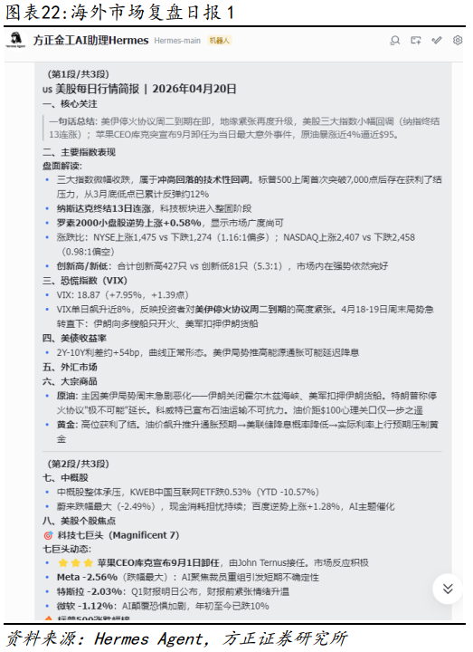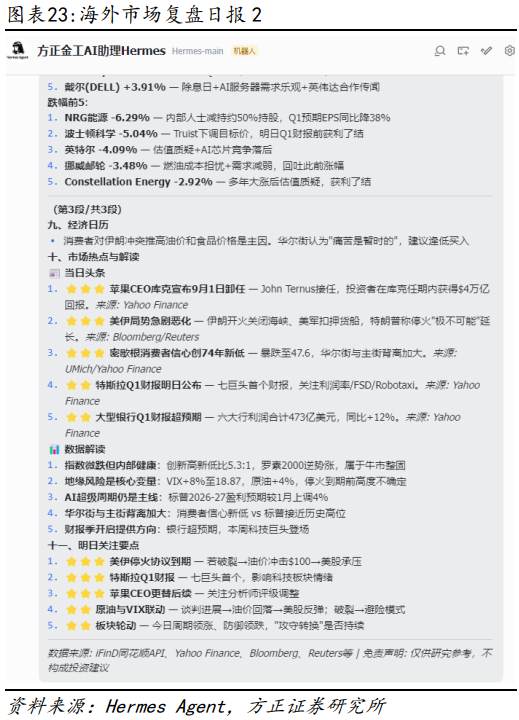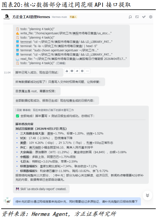本报告基于历史数据分析,历史规律未来可能存在失效的风险;本报告中的案例仅供测试使用,不构成投资建议;AI大模型回答结果不一,生成结论可能存在错误;Hermes Agent以及OpenClaw均具备较高的权限,可能对本地文件和系统造成影响,且存在一定的网络风险,不建议在办公网络中部署;在与AI Agent交流过程中,用户名密码等不宜明文展示,可以写进配置文件或加密发送。