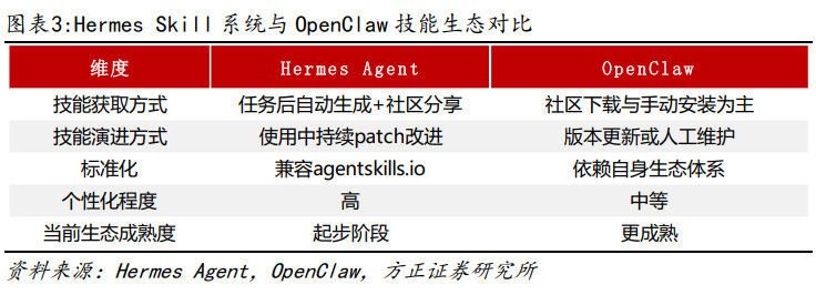 Hermes Agent与OpenClaw是互补而非替代关系。OpenClaw依托社区生态的“应用商店模式”在技能丰富度上具备优势;Hermes Agent采用“内生成长模式”,从用户自身工作流中孵化个性化自动化流程,对金融投研等强路径依赖的专业场景更具贴合度与长期延展性。两者可在同一服务器并存部署,灵活选用。