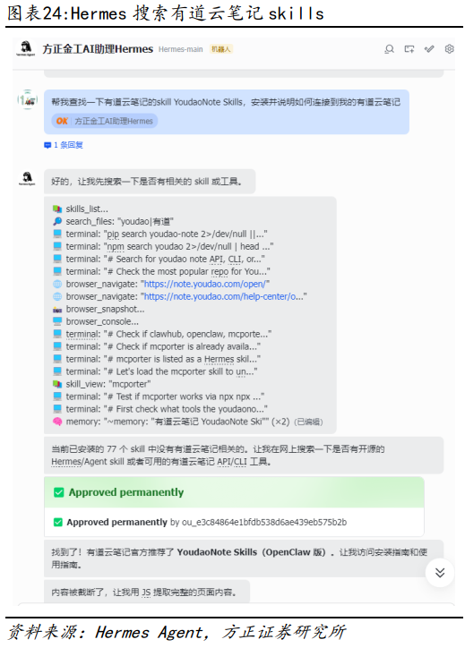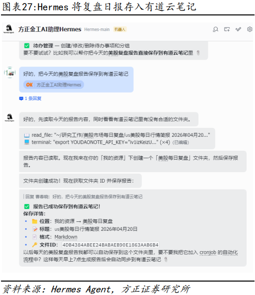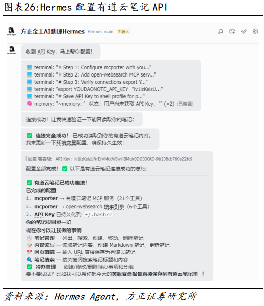 除以上新增笔记外,也可以让Hermes Agent从有道云笔记中整理和分析上市公司调研纪要,或基于有道云笔记的信息进行提问交流,从而实现将有道云笔记作为第二大脑的目的。