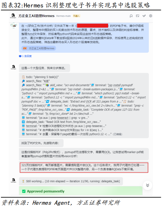 在金融投研实践中,有大量优秀的书籍或者文档资料,此前需要投资者花大量时间和精力来阅读和实践。随着AI Agent的快速发展,目前已基本可以通过Agent来快速复现和使用书籍或文档中的优秀投资案例和方法论。本节中我们将通过Hermes Agent来批量阅读和复现电子书中的形态选股策略。