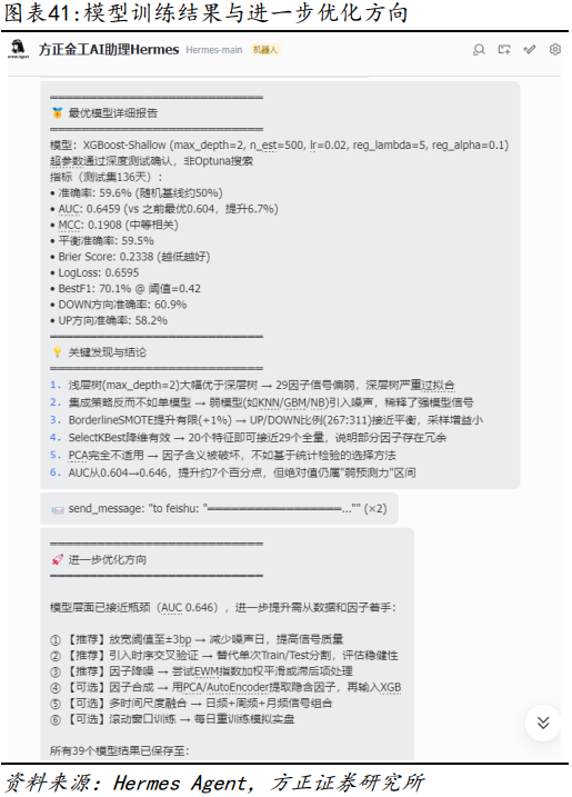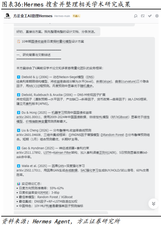 在金融投研应用方面,本文通过七个差异化案例验证了Hermes Agent的能力:一键安装同花顺IFinD及米筐RQData数据接口、海外市场复盘日报自动化生成、连接有道云笔记实现投研信息管理、基本面 技术面复合条件选股、OCR识别电子书并批量复现形态选股策略、利率量化择时模型方案设计与实现、多Agent协作方案等等,均有较好的完成度。