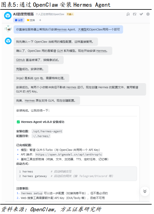 在OpenClaw给出具体的配置步骤之后,我们可以直接让其帮我们安装并配置好Hermes,大模型API Key可以直接与OpenClaw保持一致。