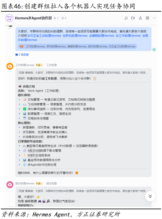 关于如何在飞书开放平台创建对应不同Agent的飞书机器人,可以参考前序报告《OpenClaw赋能金融投研应用进阶:多Agent协作、Token优化、Skills应用与开发——AI Agent赋能金融投研应用系列之四》,本文不再赘述。当所有配置完成之后,我们可以将各个Agent所对应的飞书机器人拉到同一个群组,以实现类似于“一人公司”的多Agent工作模式。