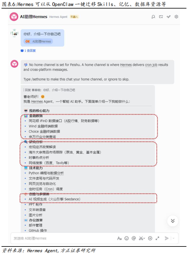 此外,还可以将OpenClaw上已经配置好的数据库资源、Skills、记忆文件等一键迁移至Hermes上,从而实现快速应用。如下图所示,上述新部署好的Hermes已从OpenClaw迁移了完整的数据库资源(同花顺IFinD数据接口等)、Seedance视频生成等Skills、以及一些研究分析任务的记忆等。