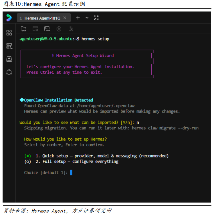 与OpenClaw配置类似,此处我们输入hermes setup,即开始配置Hermes Agent,如下图所示。