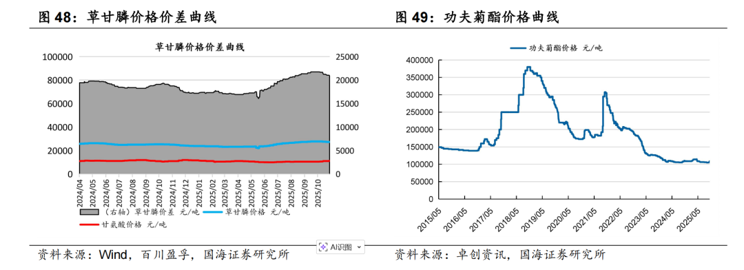 据Wind和百川盈孚,2025年11月7日功夫菊酯原药价格为10.9万元/吨,较10月31日上涨0.3万元/吨;联苯菊酯原药价格为12.9万元/吨,较10月31日上涨0.3万元/吨;草甘膦原药价格为2.73万元/吨,较10月31日持平。利尔化学:公司利用自身技术优势,成为国内首家掌握草铵膦、精草铵膦大规模化合成关键技术的企业。公司在精草铵膦工艺上不断创新,形成了一批高价值专利,并积极推进专利的全球布局,技术处于全球领先水平。据Wind和百川盈孚,2025年11月7日草铵膦原药价格为4.45万元/吨,较10月31日持平。广信股份:公司是国内最大的以光气为原料的农药及精细化工中间体企业,依托光气资源,布局多菌灵、甲基硫菌灵、敌草隆等原药产品。公司通过对世星药化收购,向产业链下游延伸布局对氨基苯酚,进入医药中间体行业,与公司对硝基氯化苯业务形成有效协同。