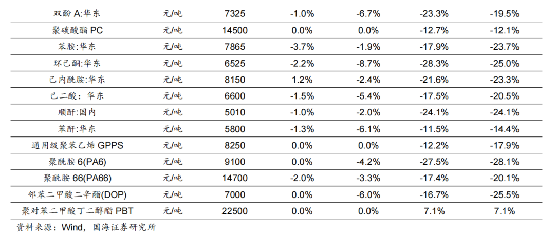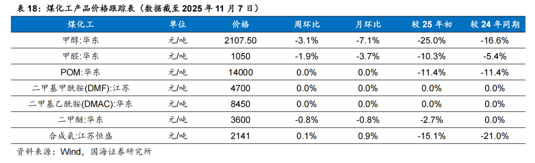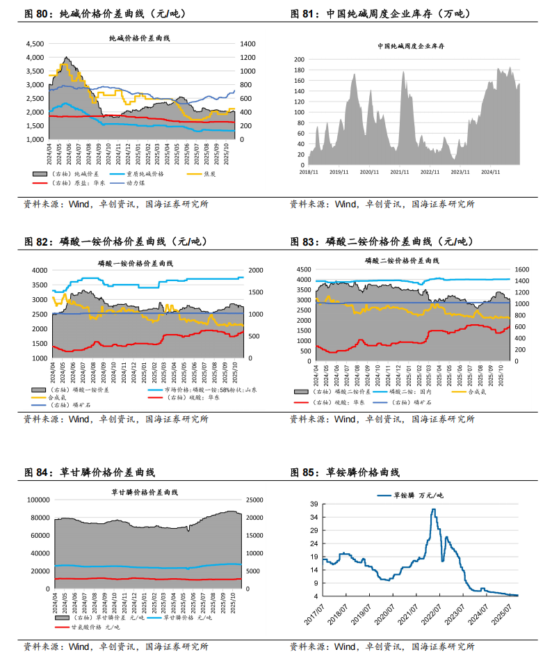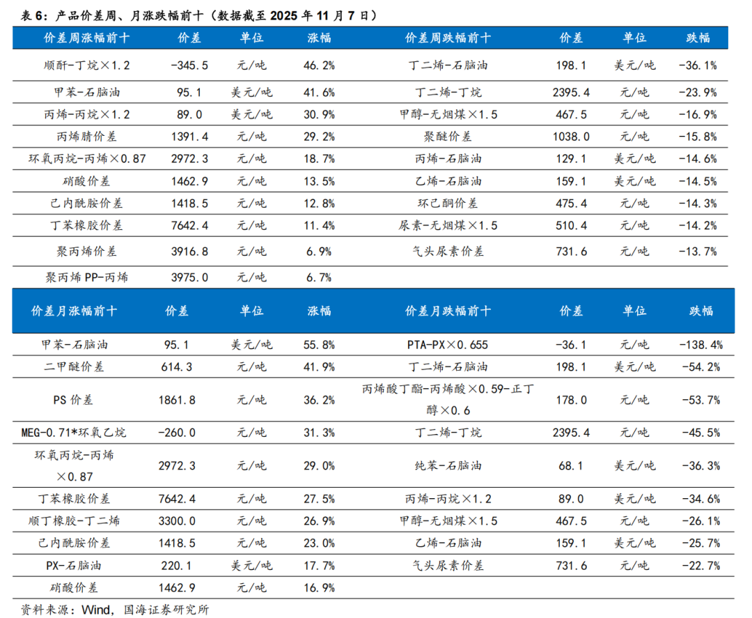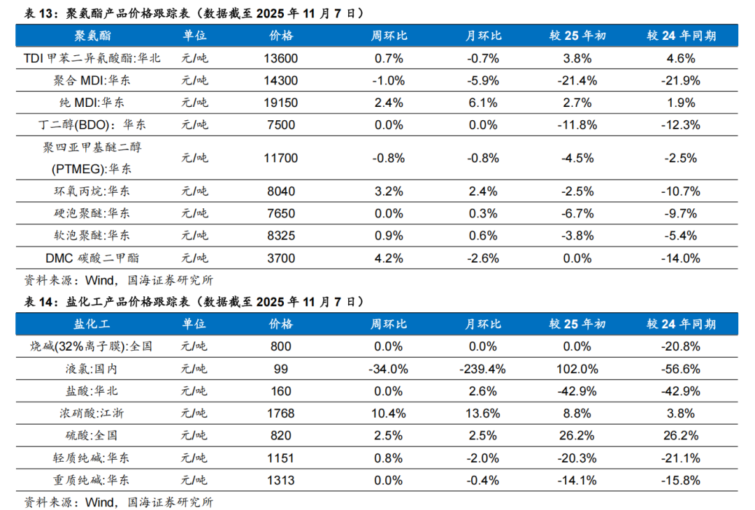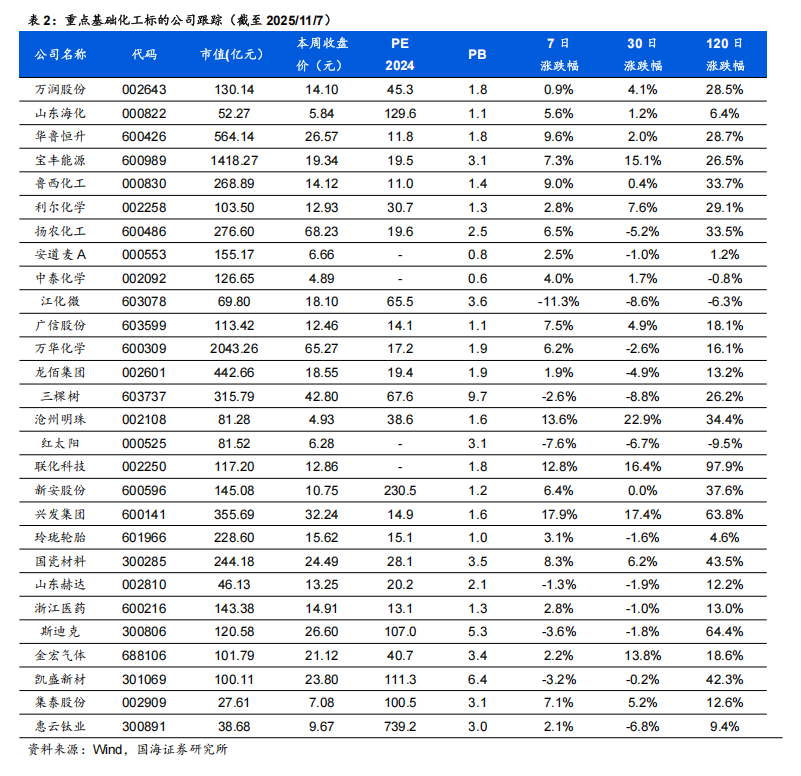 据Wind,2025年11月7日,维生素A价格为63.00元/千克,环比10月31日持平;维生素E价格为52.50元/千克,环比10月31日持平。博源化工:据Wind和百川盈孚,2025年11月7日重质纯碱价格为1313元/吨,较10月31日持平;轻质纯碱价格为1151元/吨,较10月31日上涨9元/吨;尿素价格为1600元/吨,较10月31日上涨10元/吨;动力煤价格为810元/吨,较10月31日上涨45元/吨。三友化工:公司年产20万吨有机硅扩建项目目前已进入试生产阶段,项目达产后,公司有机硅单体产能将达到40万吨/年。随着生产规模的不断扩大,公司规模经济效益显著,行业竞争力明显提升。据百川盈孚,2025年11月7日粘胶短纤现货价为13050元/吨,环比10月31日持平。华鲁恒升:华鲁恒升的低成本为公司核心竞争优势。公司重视先进技术的引进与消化吸收并自我提升,致力打造精品高效工程,从源头降低投资成本;公司以煤气化平台为基础,构筑一体化运行模式,创建多产品链协同生产;深挖装置与系统潜力,提高资源综合利用率;公司坚持精益化管理,坚持降本控费;依托固有优势,持续推进产业链的延伸拓展和产品的迭代升级,开辟新的盈利增长点。公司秉承创新驱动发展理念,通过不断的技术创新,掌握了一批核心关键技术;依托洁净煤气化技术,构建了可持续发展的产业技术平台,形成“一头多线”循环经济柔性多联产运营模式。据百川盈孚,2025年11月7日乙二醇价格为4053元/吨,环比10月31日下降86元/吨。据卓创资讯,2025年11月7日尿素小颗粒价格为1550元/吨,环比10月31日下降30元/吨。宝丰能源:公司是高端煤基新材料领军企业,具有规模优势,并且在持续扩大产能;产业链高度一体化,成本优势明显,且生产效率还在不断提高;项目建设发展强劲,进一步巩固成本优势。未来宝丰能源有望成为世界顶级煤制烯烃生产商,盈利空间大,抗风险抗周期能力将大幅提升。金禾实业:金禾实业深耕食品添加剂行业,已成为安赛蜜、三氯蔗糖和麦芽酚等领域全球龙头。据Wind,2025年11月7日安赛蜜市场均价达3.4万元/吨,环比10月31日下降0.1元/吨;三氯蔗糖市场均价达12万元/吨,环比10月31日持平;麦芽酚市场均价达7.8万元/吨,环比10月31日持平。瑞华泰:PI膜性能居于高分子材料金字塔的顶端,应用范围广泛,具有非常高的技术壁垒。公司自主掌握高性能PI薄膜的核心技术,包括合成、设备、工艺等技术,形成了从专用树脂合成到连续双向拉伸薄膜的完整制备技术。随着资金问题的解决,公司进入加速扩张期。当前折叠屏手机有望迎来产业发展期,未来随着公司两个项目陆续投产,公司业绩有望迎来快速增长。赞宇科技:赞宇科技主要以棕榈油为原料生产油脂化工和表面活性剂,是油化、表活龙头企业,公司印尼杜库达子公司低价采购棕榈油优势明显,同时杭州油化还拟投2万吨OPO结构脂,用于高端奶粉。截至2024年上半年,公司表面活性剂年产能突破120万吨,油脂化学品年产能突破100万吨,洗护用品OEM/ODM加工服务能力达到110万吨。国瓷材料:国瓷材料是我国新材料公司标杆,是无机新材料平台型公司。国瓷熟练掌握了水热法核心技术,内生的MLCC陶瓷粉、氧化锆、氧化铝均达到世界级水平;外延并购的王子制陶(陶瓷制品)和爱尔创(氧化锆下游制品)均是公司产品的下游。国瓷产品除了技术同源性强,市场规模也非常可观。大市场为公司提供了高速成长的舞台。外延并购为国瓷新产品打开了市场渠道,公司利用先进的DBS精益并购管理系统发展外延业务,做到产品不仅能造得出来,还能卖得出去。扬农化工:公司是菊酯行业寡头,菊酯为高效低毒农药,随着优嘉三期投产,释放菊酯年产能1.08万吨,公司聚酯产能大幅增加。公司积极调整产品结构,主推效力更高的产品,同时公司通过不断投产新项目,扩大规模优势与产品线,不断降低成本。2019年公司购买中化国际持有的中化作物100%股权和农研公司100%股权,公司子公司优嘉公司受让宝叶公司100%股权,完善了研产销一体化的资源配置。“两化”农业资源整合于先正达集团,形成SAS格局,意在优化资源配置,加强产业协同,形成高效完整的供应链,有利于降低生产成本,更具竞争优势。