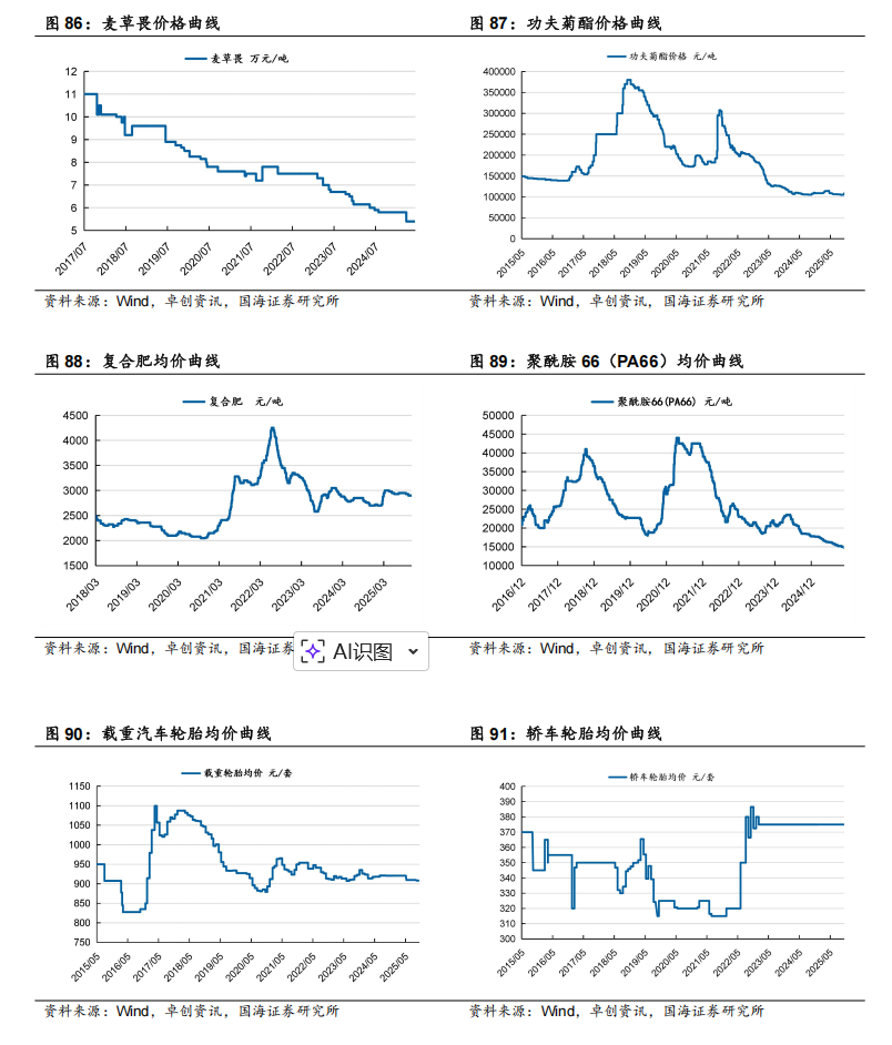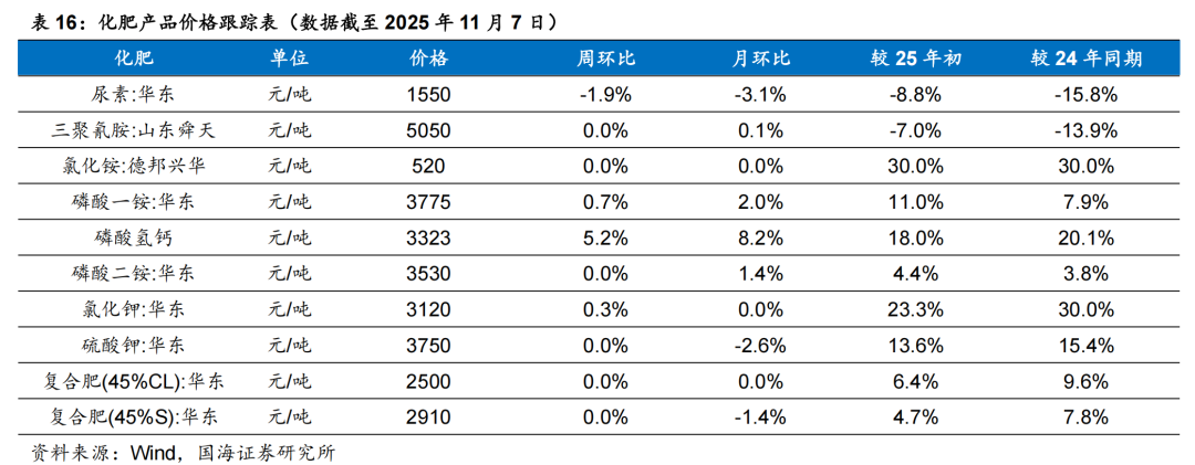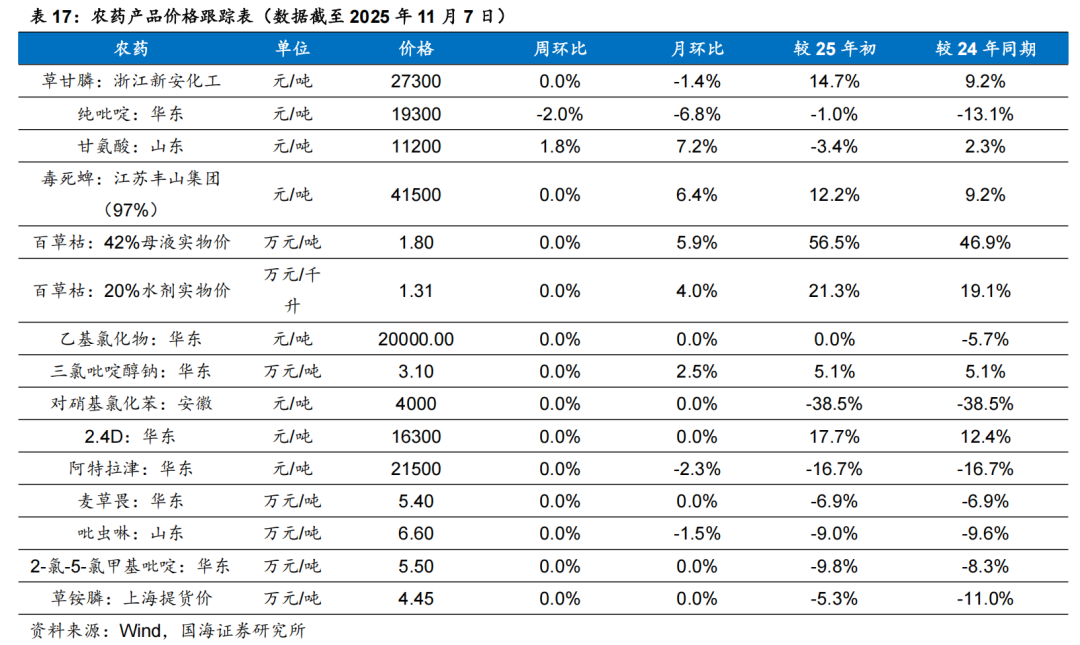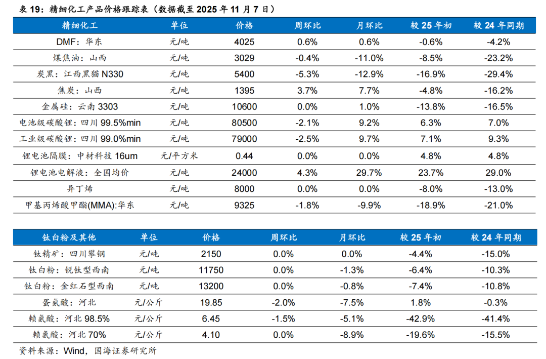 据Wind和百川盈孚,2025年11月7日甲基硫菌灵原药(白色)价格为3.20万元/吨,较10月31日持平;多菌灵原药(白色)价格为3.70万元/吨,较10月31日持平;敌草隆价格为3.30万元/吨,较10月31日持平。国光股份:公司是国内植物生长调节剂的龙头,农业服务先行者。公司是国内植物生长调节剂登记品种最多的企业,也是国内植物生长调节剂制剂销售额最大的公司。随着土地流转、消费升级、粮食价格上涨,以及园林城市建设等需求的刺激,植物生长调节剂需求量大增,公司有望实现高增长。公司具备农业技术服务型品牌优势、完善的销售网络和全国最完善的植物生长调节剂登记证三重护城河,保障公司不断提升市场份额。长青股份:据Wind和百川盈孚,2025年11月7日吡虫啉原药价格为6.60万元/吨,较上周10月31日下降0.10万元/吨;氟磺胺草醚原药价格为11.00万元/吨,较上周10月31日持平;异丙甲草胺原药价格为2.30万元/吨,较上周10月31日下降0.10万元/吨;丁醚脲价格为9.30万元/吨,较10月31日持平。海利尔:公司是国内丙硫菌唑龙头,技术和成本优势突出。截至2024年底,公司农药产能9.12万吨。梅花生物:据Wind,2025年11月7日,98%赖氨酸价格为6525元/吨,较10月31日下降150元/吨;70%赖氨酸价格为4300元/吨,较10月31日下降50元/吨;苏氨酸价格为8450元/吨,较10月31日上涨100元/吨;缬氨酸价格为12550元/吨,较10月31日上涨150元/吨;味精价格为6222元/吨,较10月31日下降222元/吨;玉米价格为2239元/吨,较10月31日下降1元/吨。三棵树:公司加大营销网络覆盖,已基本覆盖全国省级行政区划单位的主要城市、直辖市、一线及新一线城市,并深耕地、县、乡镇级市场,进驻各区域前列建材商圈,并与红星、居然等连锁家居卖场和头部装饰公司、物业集团形成VIP级战略合作。金发科技:未来公司仍将有大量改性塑料、环保高性能塑料上马,同时,受益于下游需求拉动,公司未来增长可期。公司先后开发出了完全生物降解塑料、特种工程塑料、高性能碳纤维及其复合材料等国际先进水平的高端新材料产品100多种,据公司2024年报,公司累计申请国内外专利共计6813件。道恩股份:公司是国内热塑性弹性体龙头。同时,公司积极开展HNBR在新能源领域的应用,公司HNBR在电池碳管分散剂领域验证成功、具备批量条件。在电池正极、隔膜涂层的粘结剂方面,正在开展相关的验证工作,目前公司紧跟国外技术发展路径和应用,及时跟踪掌握国内厂家的应用反馈,大力开拓新能源电池领域的应用。万润股份:公司在功能性材料方面,公司依托于在化学合成领域的科技创新与技术积累及延伸,先后涉足了液晶材料、OLED材料、沸石系列环保材料等多个领域,并已在相应领域取得了业内领先地位。在生命科学与医药产业方面,公司经过多年对医药市场的开拓和医药技术的储备,涉足了医药中间体、原料药、成药制剂、生命科学、体外诊断等多个领域。山东赫达:公司是国内纤维素醚龙头。公司基于一体化产业链优势,沿着纤维素醚产业链布局。此外,公司切入植物肉新领域,培育新的业绩增长点。新亚强:公司主要产品包括六甲基二硅氮烷、苯基氯硅烷及下游产品、乙烯基封头等。其中六甲基二硅氮烷主要可作为硅油和硅橡胶的加工助剂,可作为半导体的清洗剂,可以作为抗病毒药物及抗生素的原材料,同时可以加入到锂电池电解液当中提高稳定性,行业产能稳定,下游需求广泛。苯基氯硅烷作为单体合成的苯基硅橡胶,具有耐热、耐电压等多种性能,可用于消费电子等多种领域。凯盛新材:凯盛新材是氯化亚砜和芳纶聚合单体(间/对苯二甲酰氯)的龙头企业,国内唯一一家具备聚醚酮酮(PEKK)完整技术体系的产业链一体化厂商,同时公司基于氯化亚砜进军新型锂盐LiFSI。雅克科技:雅克科技通过“并购 投资 整合”的商业模式不断完善电子材料版图。公司连续收购UPChemical(晶圆制造前驱体材料)、华飞电子(半导体封装材料)、科美特公司(电子特气)、LG化学彩色光刻胶部门(光刻胶)等标的,并与韩国Foures公司(气体输送设备制造商)合资设立福瑞半导体公司,与韩国Jaewon公司(提供光刻、清洗、刻蚀等电子化学品)签署合作备忘录;公司正逐步打造完善的半导体材料产品线和一线大厂的客户资源,有利于充分发挥市场协同作用。未来公司将坚定地沿着并购 投资 整合的模式发展下去。江化微:江化微专注湿电子化学品领域,是国内生产规模大、品种齐全、配套完善的服务型供应商。蓝晓科技:蓝晓科技是我国高端吸附分离树脂龙头,拥有自主研发的针对我国青海盐湖特点的吸附分离提锂技术。同时,在生命科学领域,研发和销售表现活跃:多肽合成载体用于胸腺多肽生产、核酸合成载体等产品,粉末树脂系列用于医用,固相载体、层析和生命科学领域新品推动了生物医药品种的丰富和市场对标,获得市场认可并形成销售量,成为公司快速增长的板块之一。中化国际:中化国际是国内环氧树脂和环氧氯丙烷、橡胶防老剂、对位芳纶的龙头企业,坚定向化工新材料领先企业的战略转型,聚焦核心产业链的打造,多条产业链具有突出的竞争优势。