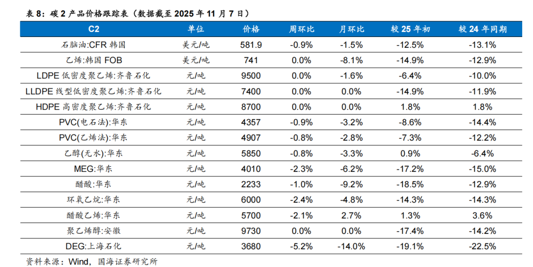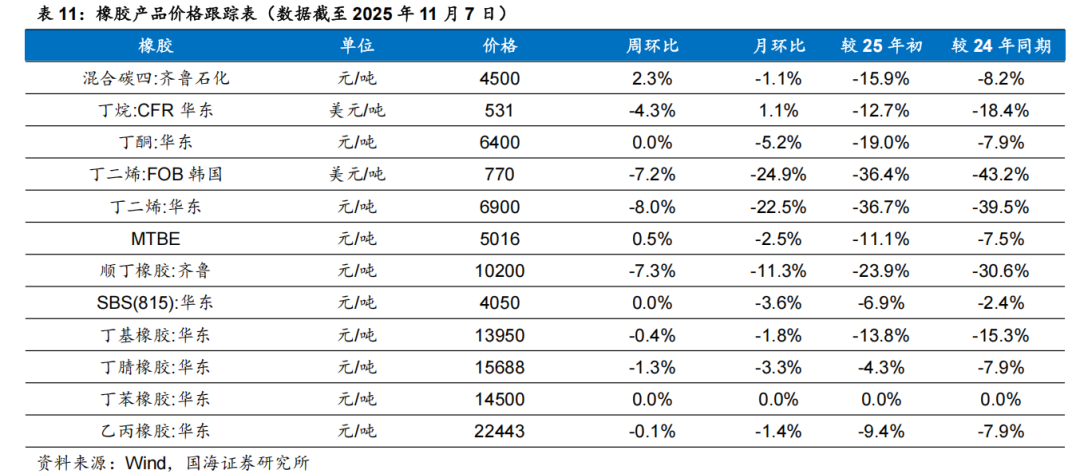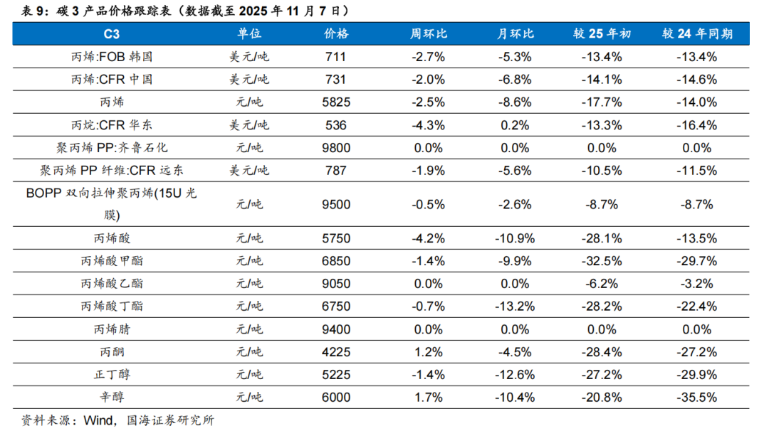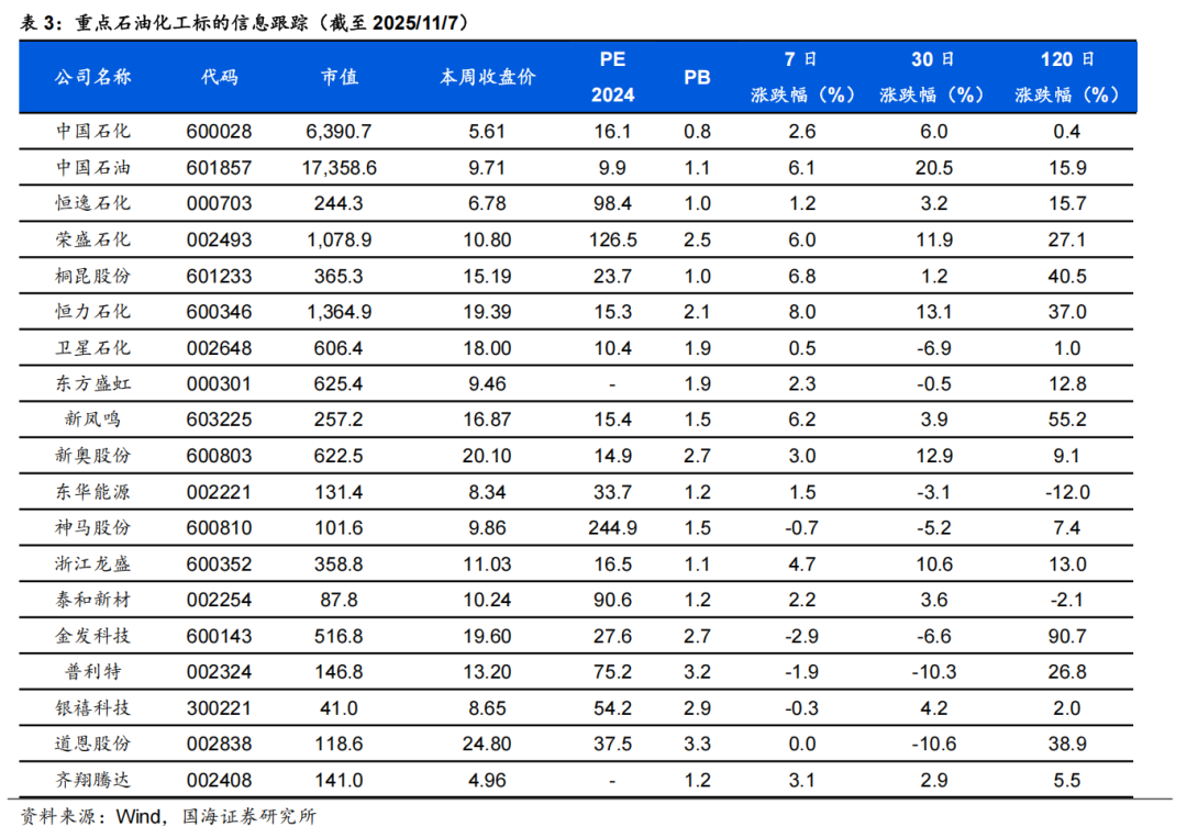 齐翔腾达:齐翔腾达已形成完善的碳四深加工产业链,并往碳三产业链延伸。目前,公司已形成以甲乙酮、顺酐为主导,丁二烯、顺丁橡胶、MTBE、异辛烷、异丁烯、叔丁醇、丙烯、甲基丙烯酸甲酯、丁腈胶乳等为主要产品组合的产品结构。公司新建项目70万吨/年丙烷脱氢项目、30万吨/年环氧丙烷项目、8万吨/年丙烯酸及6万吨/年丙烯酸酯项目建成后将形成比较完善的丙烷-丙烯-环氧丙烷/丙烯酸的碳三产业链布局,实现公司的产业版图从碳四产业向碳三产业的顺利延伸。同时公司已建成投产的20万吨/年丁腈胶乳装置和20万吨/年MMA装置的建成投产将实现公司向新材料领域的扩展。根据Wind,2025年11月6日顺酐价格为4850元/吨,环比10月31日下降170元/吨;据卓创资讯,2025年11月7日丁酮价格为6543元/吨,环比10月31日持平。巨化股份:公司是国内领先的氟化工、氯碱化工新材料先进制造业基地,主要业务为基本化工原料、食品包装材料、氟化工原料及后续产品的研发、生产与销售。公司拥有氯碱化工、硫酸化工、煤化工、基础氟化工等氟化工必需的产业自我配套体系,并以此为基础,形成了包括基础配套原料、氟制冷剂、有机氟单体、含氟聚合物、含氟精细化学品等在内的完整的氟化工产业链,并涉足石油化工产业。永和股份:公司主营业务为氟化学产品的研发、生产、销售,现已形成从萤石矿、氢氟酸、甲烷氯化物、氟碳化学品到含氟高分子材料、含氟精细化学品的完整产业链。公司主要产品包括氟碳化学品单质(HCFC-22、HFC-152a、HFC-143a、HFC-32、HFC-227ea、HFC-125等)、混合制冷剂(R410A、R404A、R507等)、含氟高分子材料及其单体(HFP、VDF、PTFE、FEP、PVDF等)、含氟精细化学品(HFPO、HFP二/三聚体、全氟己酮)以及氢氟酸、一氯甲烷、甲烷氯化物、氯化钙等化工原料。