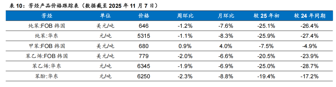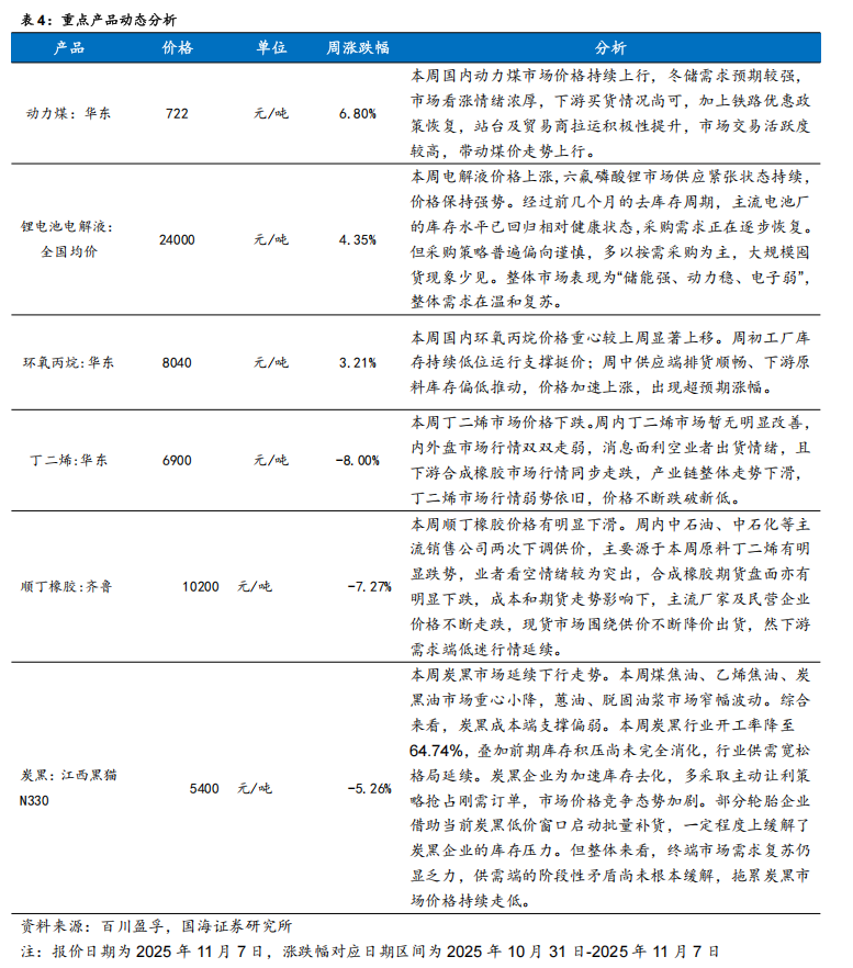本周(2025年11月31日-2025年11月7日,下同)国内动力煤市场价格持续上行,冬储需求预期较强,市场看涨情绪浓厚,下游买货情况尚可,加上铁路优惠政策恢复,站台及贸易商拉运积极性提升,市场交易活跃度较高,带动煤价走势上行。本周电解液价格上涨,六氟磷酸锂市场供应紧张状态持续,价格保持强势。经过前几个月的去库存周期,主流电池厂的库存水平已回归相对健康状态,采购需求正在逐步恢复。但采购策略普遍偏向谨慎,多以按需采购为主,大规模囤货现象少见。整体市场表现为“储能强、动力稳、电子弱”,整体需求在温和复苏。本周国内环氧丙烷价格重心较上周显著上移。周初工厂库存持续低位运行支撑挺价;周中供应端排货顺畅、下游原料库存偏低推动,价格加速上涨,出现超预期涨幅。本周丁二烯市场价格下跌。周内丁二烯市场暂无明显改善,内外盘市场行情双双走弱,消息面利空业者出货情绪,且下游合成橡胶市场行情同步走跌,产业链整体走势下滑,丁二烯市场行情弱势依旧,价格不断跌破新低。本周顺丁橡胶价格有明显下滑。周内中石油、中石化等主流销售公司两次下调供价,主要源于本周原料丁二烯有明显跌势,业者看空情绪较为突出,合成橡胶期货盘面亦有明显下跌,成本和期货走势影响下,主流厂家及民营企业价格不断走跌,现货市场围绕供价不断降价出货,然下游需求端低迷行情延续。本周炭黑市场延续下行走势。本周煤焦油、乙烯焦油、炭黑油市场重心小降,蒽油、脱固油浆市场窄幅波动。综合来看,炭黑成本端支撑偏弱。本周炭黑行业开工率降至64.74%,叠加前期库存积压尚未完全消化,行业供需宽松格局延续。炭黑企业为加速库存去化,多采取主动让利策略抢占刚需订单,市场价格竞争态势加剧。部分轮胎企业借助当前炭黑低价窗口启动批量补货,一定程度上缓解了炭黑企业的库存压力。但整体来看,终端市场需求复苏仍显乏力,供需端的阶段性矛盾尚未根本缓解,拖累炭黑市场价格持续走低。
