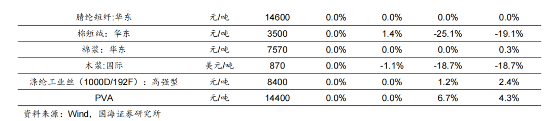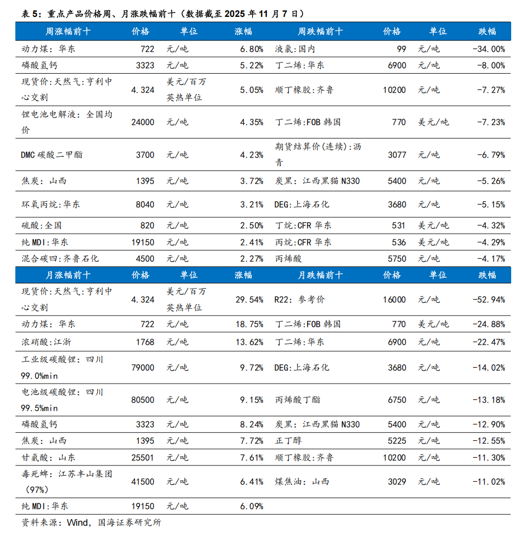 我们跟踪的171种产品的价格中,有31种上涨,占比18.13%,有65种产品下跌,占比38.01%。周涨幅前五的产品分别为:动力煤:华东(6.8%)、动力煤:华东(5.22%)、现货价:天然气:亨利中心交割(5.05%)、锂电池电解液:全国均价(4.35%)、DMC碳酸二甲酯(4.23%)。周跌幅前五的产品分别为:液氯:国内(-34%)、丁二烯:华东(-8%)、顺丁橡胶:齐鲁(-7.27%)、丁二烯:FOB韩国(-7.23%)、期货结算价(连续):沥青(-6.79%)。