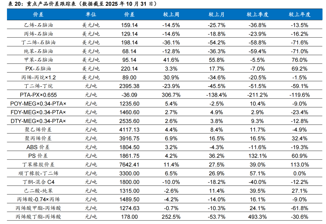 据Wind,2025年11月7日,EVA价格为10400元/吨,较10月31日持平。恒逸石化:公司是国内PTA和聚酯纤维的综合制造商,已完成“原油炼化-PX-PTA-聚酯”和“原油炼化-苯-己内酰胺-锦纶”的双产业链布局,目前参控股PTA年产能1600万吨,聚酯年产能776.5万吨,规模优势强,技术领先,成本优势明显。恒逸文莱炼化项目一期已于2019年9月投产,炼油产能达到800万吨,PX产能150万吨。二期项目稳步推进,项目1400万吨/年炼能,投资金额预计为136.54亿美元。产品包括200万吨/年对二甲苯、255万吨汽油等,同时也包括165万吨/年乙烯、250万吨/年PTA、100万吨/年聚酯瓶片,将给予公司盈利大幅增长的能力。