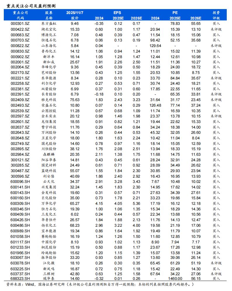 风险提示:宏观经济变化;油价震荡变化;环保趋严;产品价格大幅波动;重点关注公司业绩不达预期;中美财政政策不及预期;化工产品去库低于预期;AI数据中心建设和航空航天材料需求不及预期;全球经济增长的不确定性;磷矿石价格大幅下行;有机硅等行业原材料价格波动风险;反内卷政策不及预期风险;关税贸易政策不确定性。