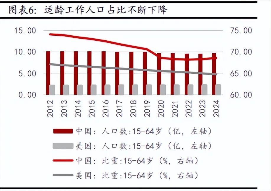 一方面,全球性的人口结构老化与劳动力供给收缩,正重塑生产要素市场,为机器替 人创造替代需求。随着全球经济的快速发展,人均寿命的不断延长以及生育率的持续 下降,全球老龄化趋势日益加剧。中国作为全球最大的制造业国家,这一趋势尤为显 著,2024年65岁及以上人口已达2.2亿,人口数量占比从2012年的9.4%增长到2024年 的15.6%,而劳动年龄人口自2013年10.1亿人的峰值后持续下滑至2024年的9.66亿。 这一结构性变化在美、日、欧等发达经济体同样深刻,全球劳动力市场的长期供需格 局已发生扭转。根据世界银行数据,美国65岁及以上的人口数量占比从2012年的13.38% 增长到2024年的17.93%,适龄工作人口占比从2012年的67.12%下降至2024年的64.75%。 全球劳动力市场供需格局的日趋紧张,使得制造业、物流、服务业等劳动密集型行业 面临日益严峻的招工难问题,这为能够提供稳定、可靠、可扩展劳动力补充的人形机 器人打开了替代空间。 另一方面,养老服务等特定领域的需求激增与人力短缺存在矛盾,使人形机器人的应 用场景从理论走向迫切。人口老龄化不仅意味着劳动力减少,更直接带来了对养老护 理、康复陪伴等服务的需求激增。然而专业护理人员存在缺口且流失率高,“机器人 养老”成为解决养老问题的可行方式之一。人形机器人凭借其拟人化形态,能够承 担或辅助护理人员完成多项任务,如移动辅助、生活照料、排泄辅助、安全监护和健 康管理等,从而减轻护理人员的负担,提升护理服务的质量和效率。此外,陪伴机器 人能够提供情感慰藉和社交交流,缓解老人的孤独感。尽管目前养老机器人的普及还 面临如技术成熟度、成本问题以及市场接受度等挑战,但随着技术的不断进步和政策 的积极推动,预计未来人形机器人在养老行业的应用将更加广泛。