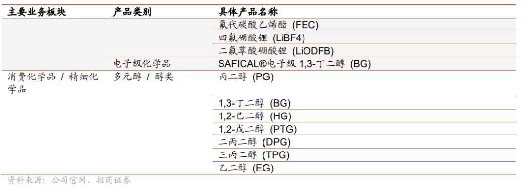 消费化学品: 公司是国内高端丙二醇(PG)、1,3-丁二醇(BDO)等多元醇产品的主要生产商之一。公司是国内唯一通过国家药品审评中心(CDE)批准和备案并提供医药级丙二醇的企业,并拥有食品生产许可证、化妆品原料安全报送码等行业资质。其1,3-丁二醇由玉米、木薯等天然原料制成,获得COSMOS证书。
