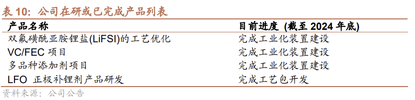 积极布局新产品。公司在传统溶剂基础上提前布局功能性、高倍率添加剂,同时研发固态电解质、正极补锂剂等前沿技术材料。公司在东营、江苏设立两大研发平台,构建了新能源材料、电子级高纯化学品、电解液研发测试、电池制备和测评四大研发板块。截至2025年6月30日,公司拥有研发人员175人,占员工总数15%,公司已获授权专利116项(其中发明专利55项),参与制定12项国家标准、行业标准及团体标准。